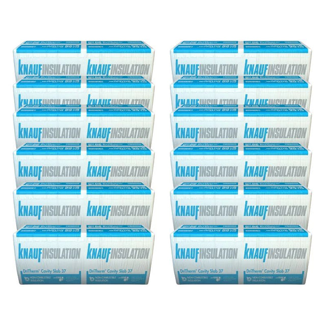 A pallet of 40 packs of 50mm Knauf Dritherm 37 is a cavity slab insulation made from glass mineral wool. It is designed for use in masonry walls where it can “friction fit” within the wall cavity. It is sized to fit between common wall-tie spacing, and is popular for use in extensions to older properties, or in conjunction with other methods of insulation to achieve a u-value that conforms to building regulations. Knauf Dritherm 37 is a full-fill insulation and is designed for cavities.